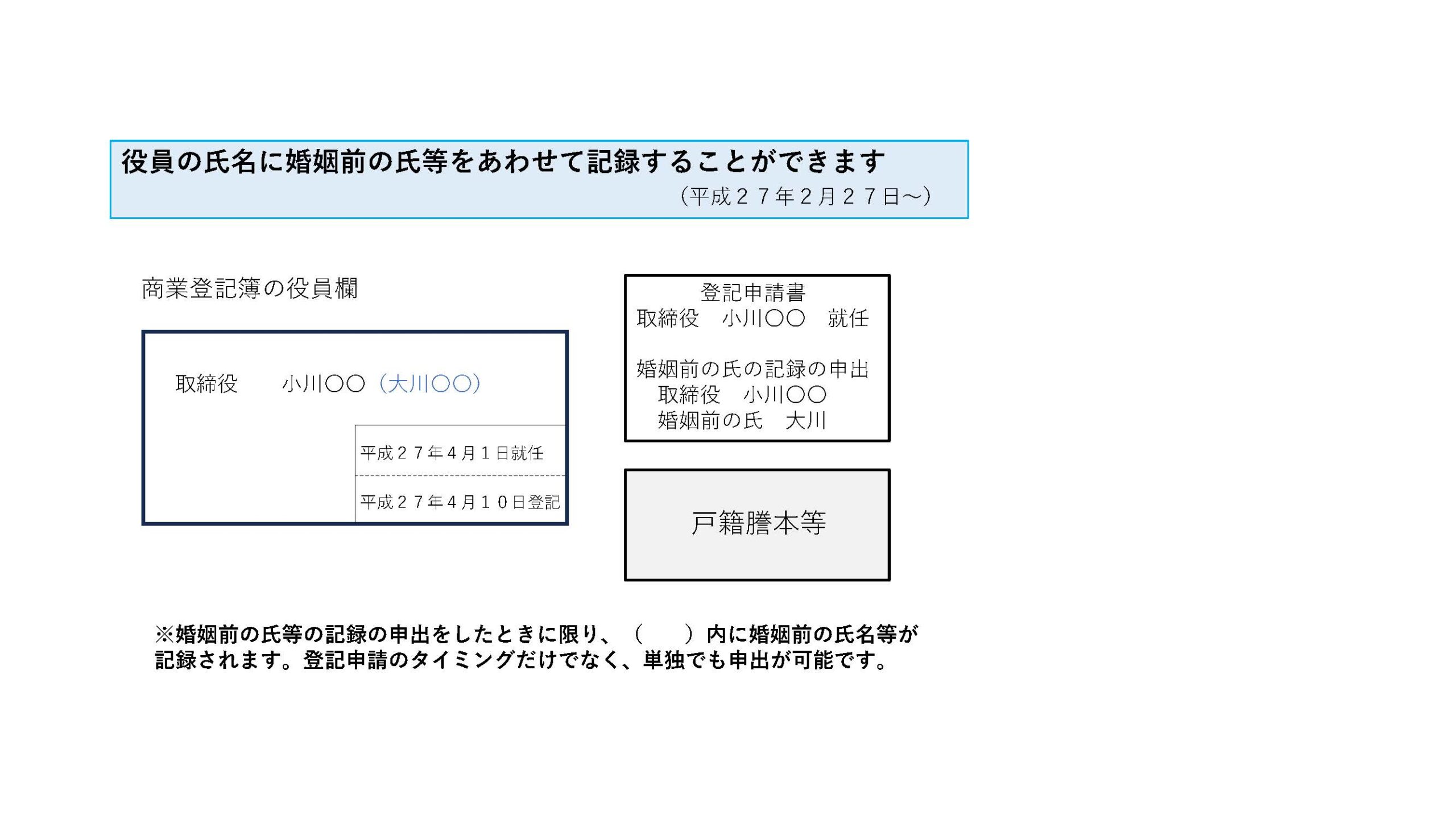 登記の申請と同時または単独で、役員または清算人につき、旧氏の記録の申出をすることができます。
