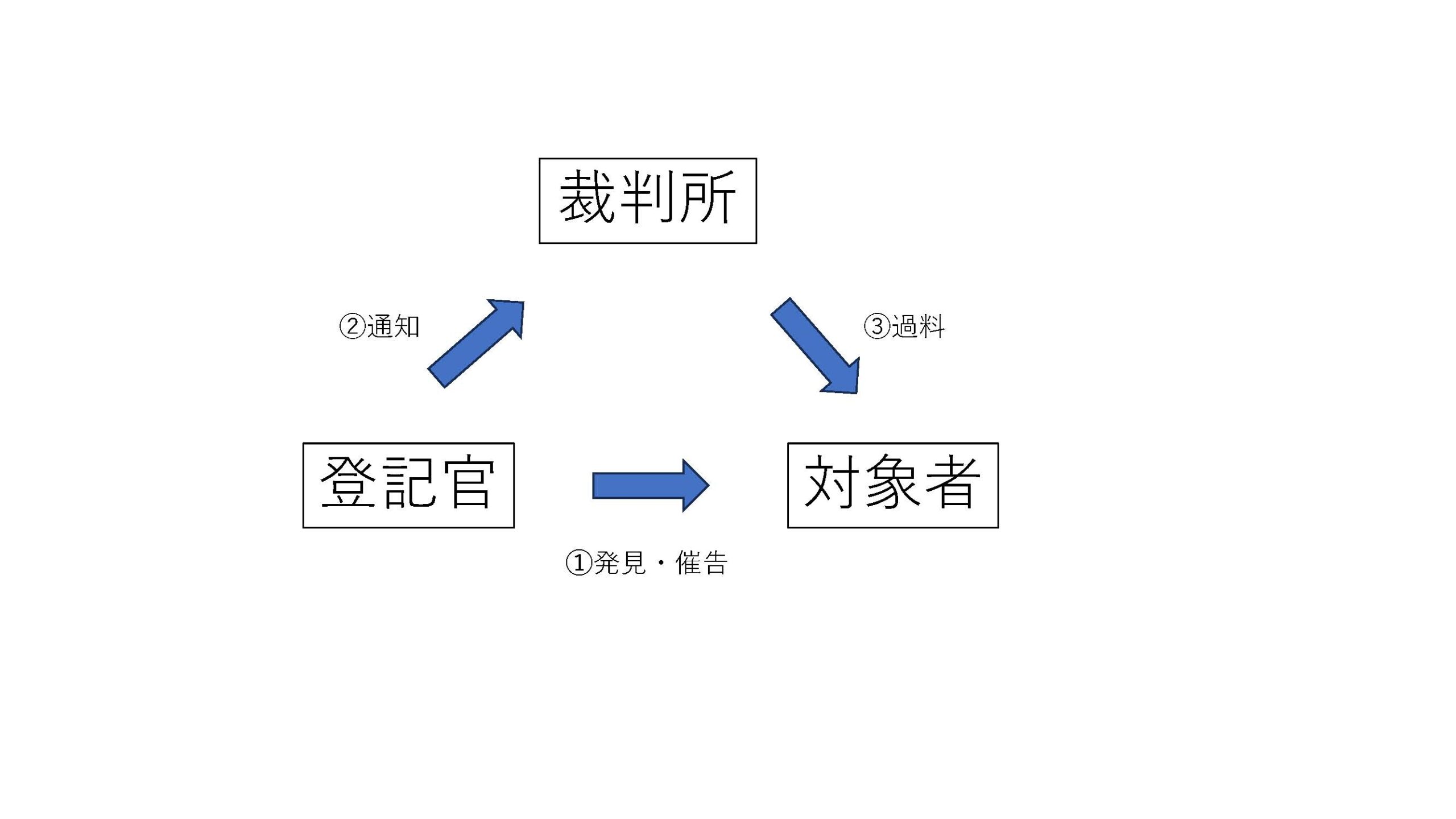 段階としては、下記の図の①→②→③という順番に進み、最終的に裁判所から過料決定の通知が送付されます。