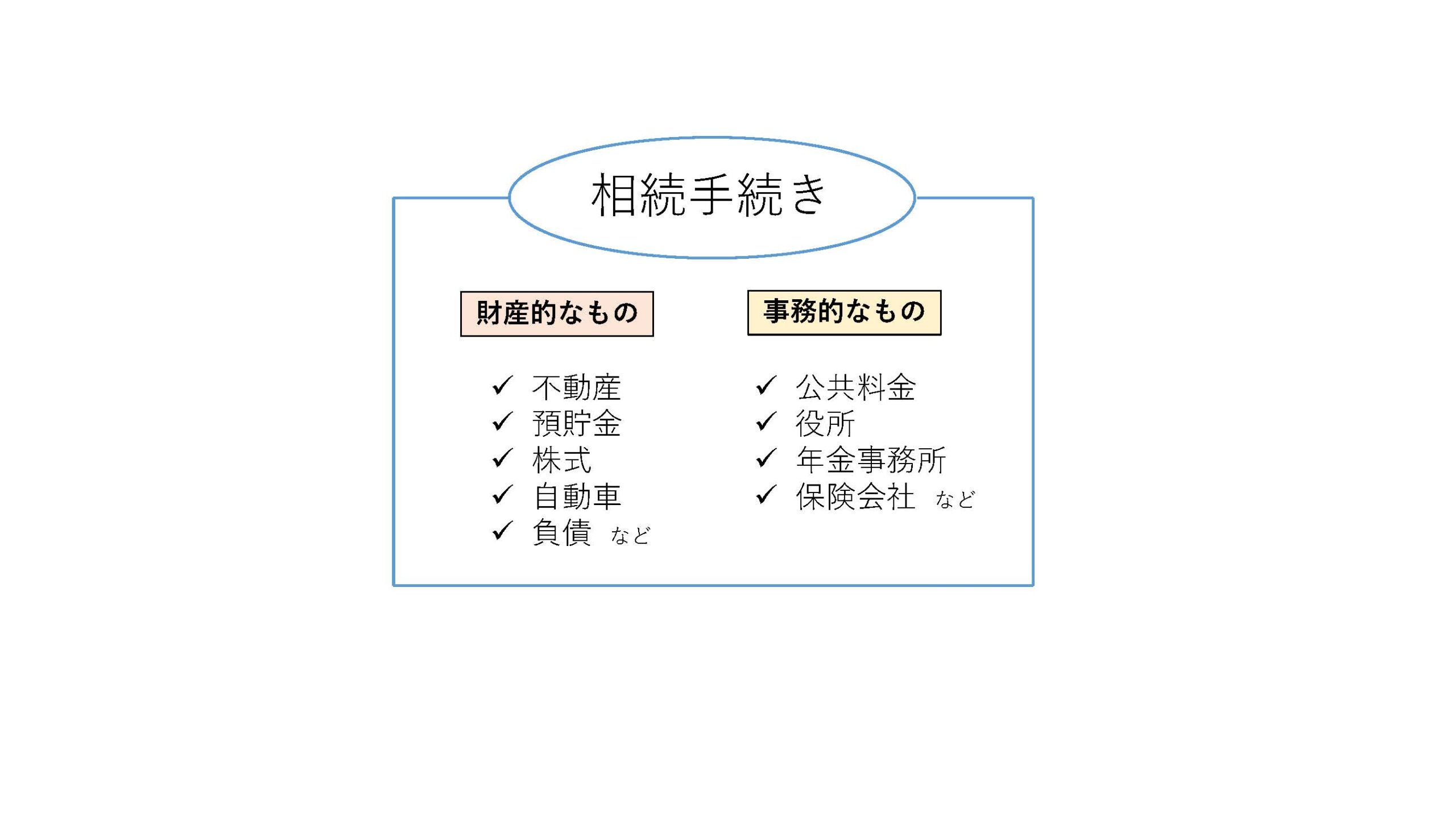 相続手続きは、不動産(自宅を含む)、預貯金・現金、株式・投資信託・国債、自動車、その他動産、負債などの財産的なものと各種公共料金の使用停止(解約)・口座変更や役所、年金事務所、保険会社などへ行う提出・請求が中心となる事務的なものの大きく2種類に分類できます。